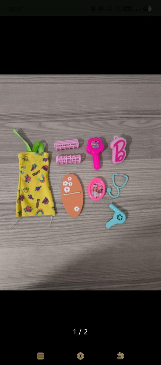Sarı küçük elbise ve saç maşası, saç kurutma makinesi, stetoskop gibi çeşitli renkli minyatür oyuncak aksesuarları içerir.