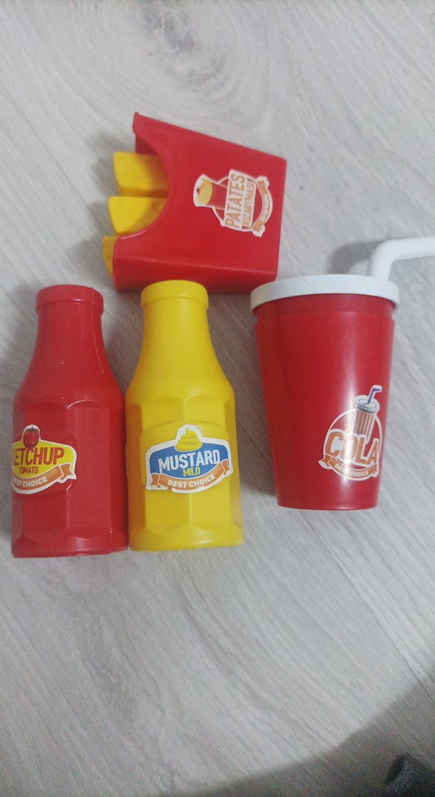 Kırmızı ve sarı renkli oyuncak ketçap, hardal şişeleri, patates kutusu ve pipetli kola bardağı seti. Canlı renkler ve eğlenceli etiketler içerir.