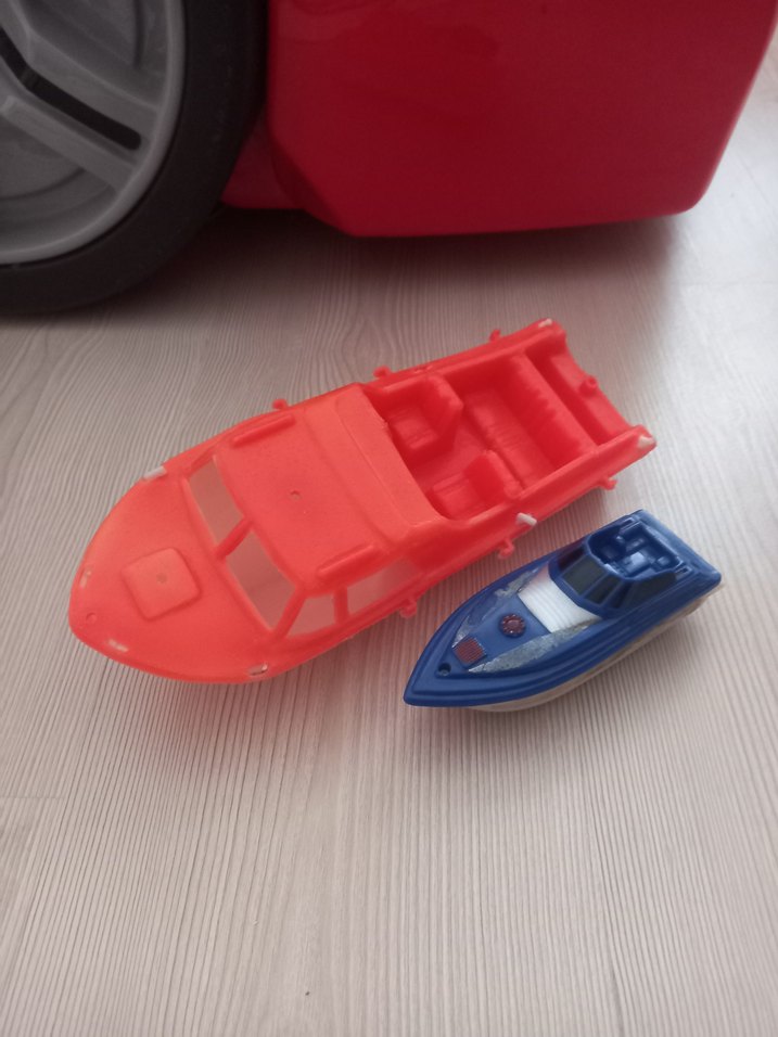 Renkli oyuncak tekne seti, dayanıklı plastikten yapılmış büyük turuncu ve küçük mavi tekneler içerir. Büyük olan 26 cm, küçük olan 15 cm'dir. Ufak tefek eksikleri mevcuttur.