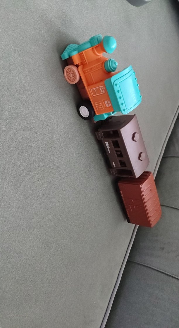 Canlı renklerde, detaylı tasarımlı oyuncak tren seti. Birbirine bağlı birkaç vagon ve tekerlekleriyle oyun için uygun.