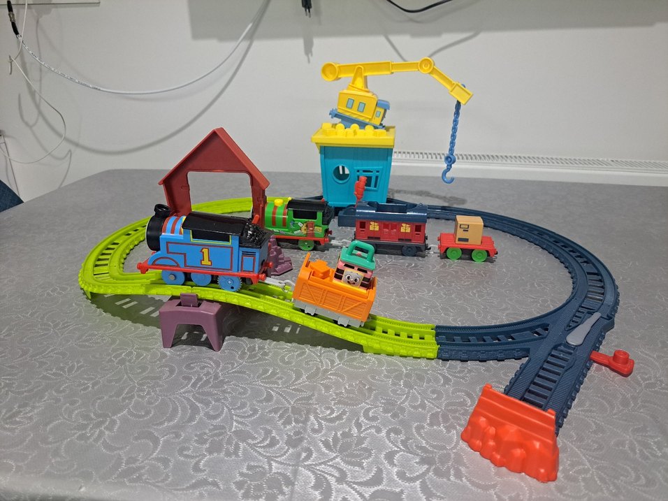 Çok renkli oyuncak tren seti, çeşitli vagonlar, raylar ve kancalı sarı vinç içerir. Sete ek olarak 1 adet daha tren ve vagonları bulunmaktadır. Ürün az kullanılmış, temiz ve çalışır durumdadır.