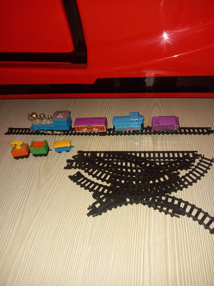 Renkli oyuncak tren seti, çeşitli vagonlar ve birleştirilebilir siyah kavisli raylar içerir. Rayların bazılarından kırıklar mevcuttur. Bi kaç lastik eksiktir. Küçük vagonlar yanında hediye gönderilecektir.