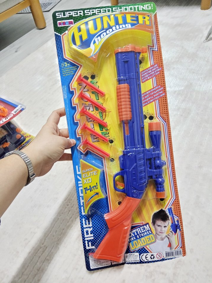 Çoklu mermi ve pompalı mekanizmalı renkli oyuncak tüfek seti.