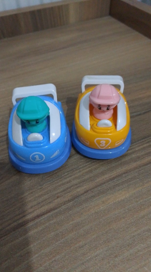 Numaralı, küçük sürücü figürlü renkli oyuncak yarış arabaları seti. Dayanıklı plastikten yapılmıştır.