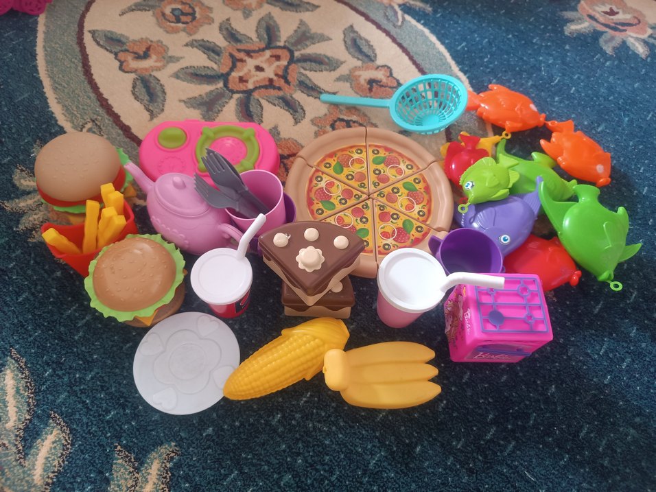 Pizza dilimleri, pipetli içecekler, mısır, sandviçler ve çatal bıçak içeren renkli oyuncak yemek seti .