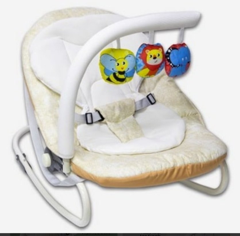 Yumuşak pedli beyaz bebek beşiğinde arı, aslan ve fil figürlü renkli oyuncaklar ve güvenlik kemerleri bulunur. az kullanıldı