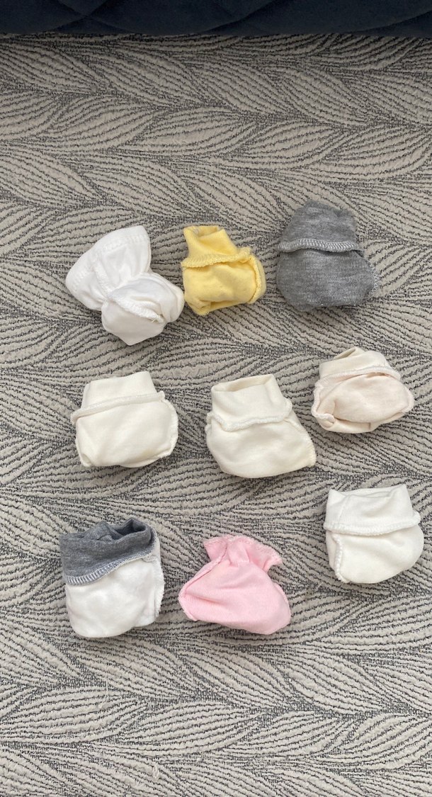 Beyaz, sarı, gri ve pembe renklerde, pamuklu yumuşak kumaştan yapılmış, bebeğe tam oturan renkli eldiven seti. Rahat ve koruyucudur.