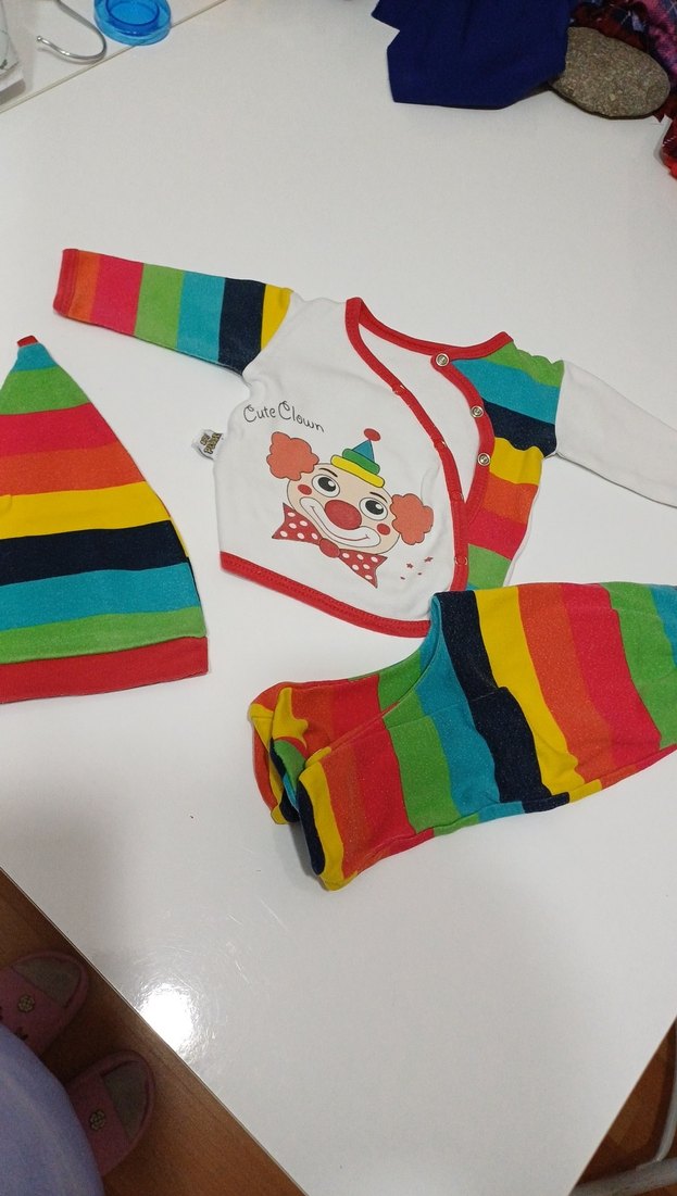Renkli pamuklu, uzun kollu, bisiklet yaka, palyaço baskılı bebek erkek takım. Çizgili pantolon ve şapka, örme detaylı.