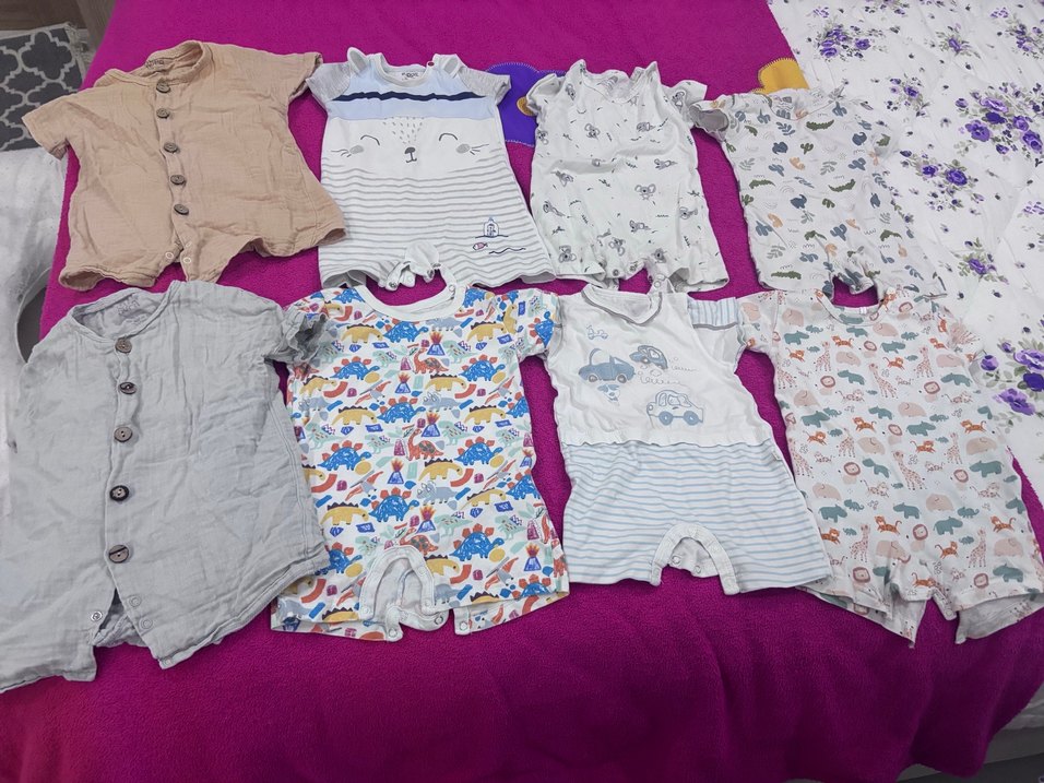 Renkli pamuklu bebek erkek tulumlar kısa kollu, yuvarlak yakalı ve örme detaylıdır, rahat sokak stili sunar. Çıtçıtlı temiz lekesiz. Müslin olanların normalde tanesi 400 tl.