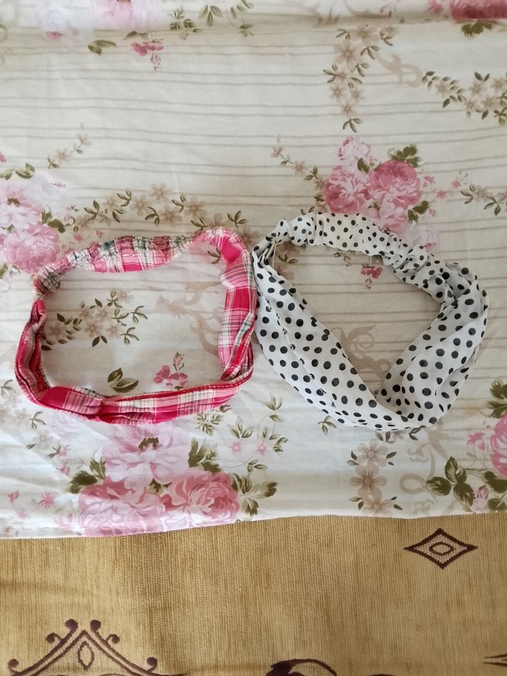 Beyaz olan biraz sarılaşmış.Elastik pamuklu saç bantları, vintage esintili pembe ekose ve siyah puantiyeli desenlere sahip. Bohem tarz için uygun.
