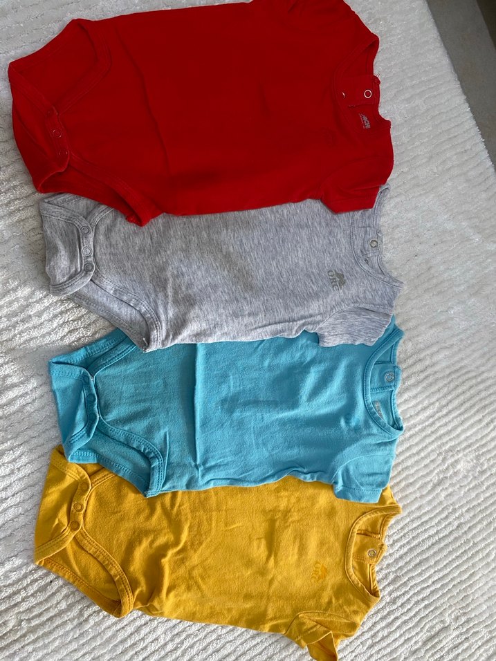 Kırmızı, gri, mavi ve sarı renklerde, kısa kollu, yuvarlak yakalı pamuklu erkek bebek body seti. Rahat ve sade tasarım, günlük kullanım için uygundur. Bebeğime olmadığı içün satıyorum