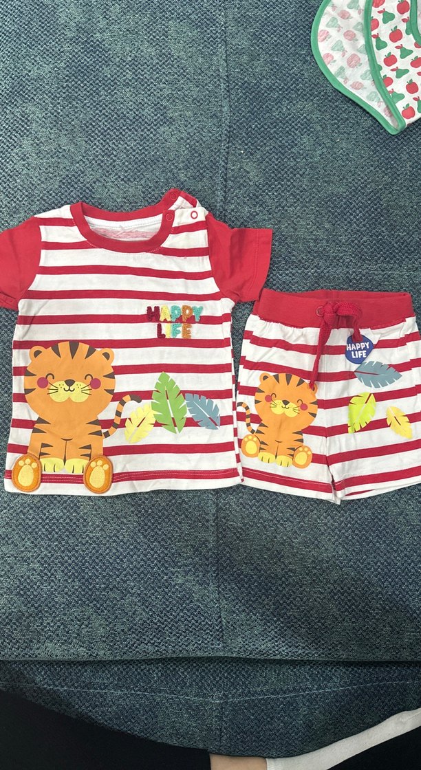 Kısa kollu, crew neck üst ve şorttan oluşan renkli pamuklu erkek bebek takımı. Kaplan ve yaprak desenleri ile örme kumaştan, rahat ve şık.