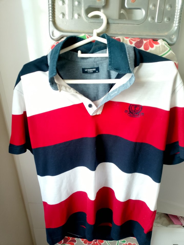 Renkli çizgili desenli, düğmeli yakalı ve kısa kollu pamuklu erkek polo tişört, rahat ve bol kesimdir. Günlük sokak stili için uygundur.