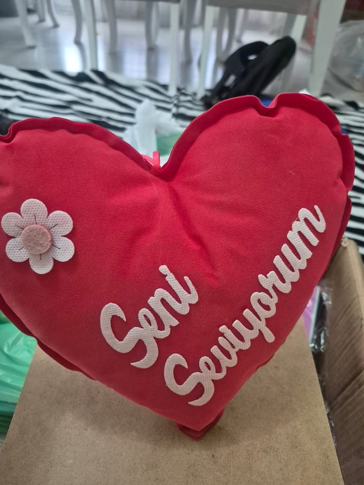 Renkli, pamuklu kalp şeklinde üzerinde "Seni Seviyorum" yazısı ve çiçek detayı bulunur.