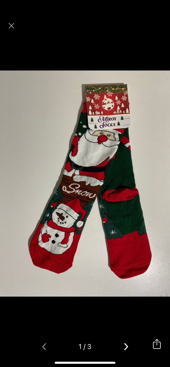 Pamuklu, renkli Noel temalı çoraplar, üzerinde Noel Baba ve kardan adam baskıları bulunur.