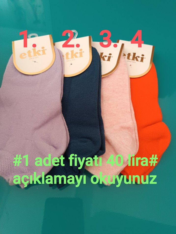 LÜTFEN İLAN AÇTIRINIZ!! 1 adet istediğiniz renk için ilan açılacaktir ( rengi numarasıyla belirtebilirsiniz) 1 adet fiyatı : 40 liradır 4 lü paket : 140 liradır ( her renkten bir adet var içinde ) 12 li set : 360 liradır (tanesi 30 lira her renkten 3 adet var içinde) Düz ve desensiz tasarıma sahip, çoklu renk seçeneğiyle sunuluyor. Yumuşak pamuktan yapılmış çorap seti. Farklı renk seçenekleri içerir. %70 pamuk #corap #soket #patik #lacivert #lila #turuncu #pembe