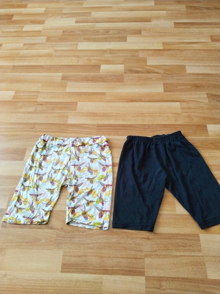 Pamuklu, rahat kesim kız şortlar. Biri renkli tropikal yaprak desenli, diğeri düz siyah, gündelik kullanıma uygun. 6-9 yaşa kadar uyar.