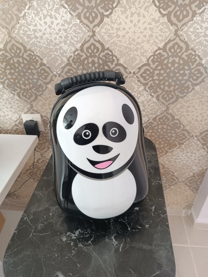 Renkli panda desenli, gri ve beyaz renklerde çocuk okul çantası. Dayanıklı saplı ve küçük boyuttadır.