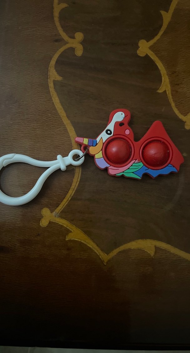 İki kırmızı kabarcık içeren renkli papağan figürlü Pop It anahtarlık, beyaz plastik kancaya sahiptir.