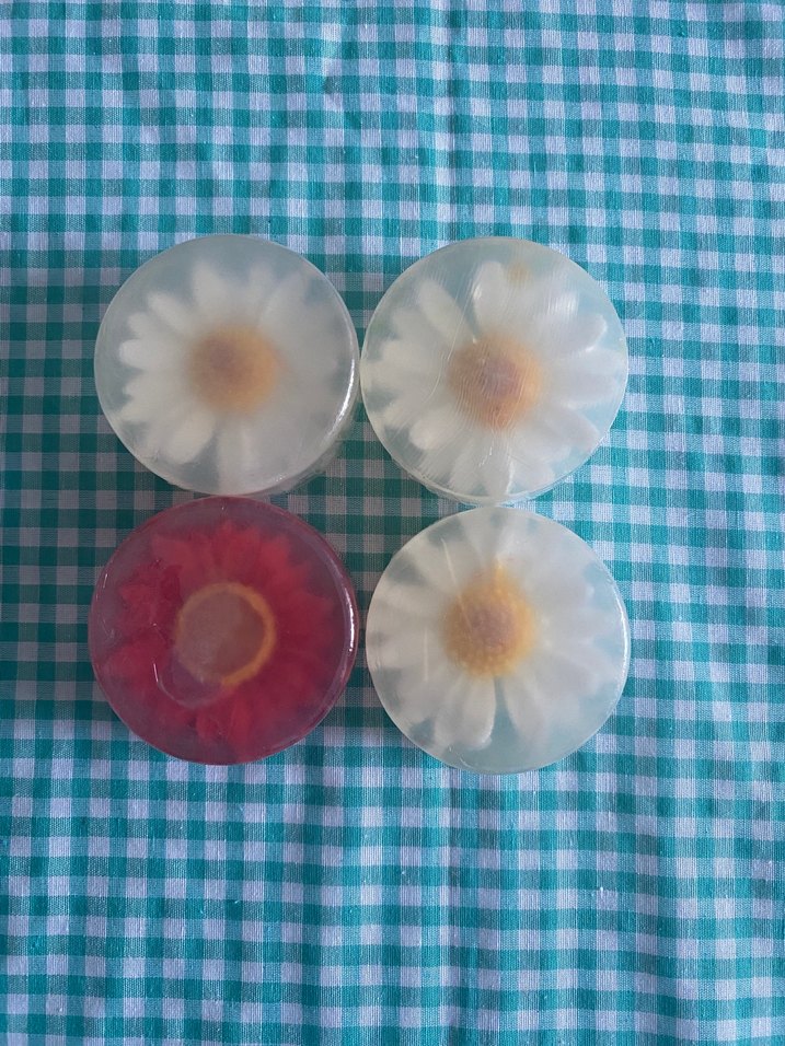 İçi papatya çiçeği desenli, beyaz ve kırmızı tonlarda renkli sabun