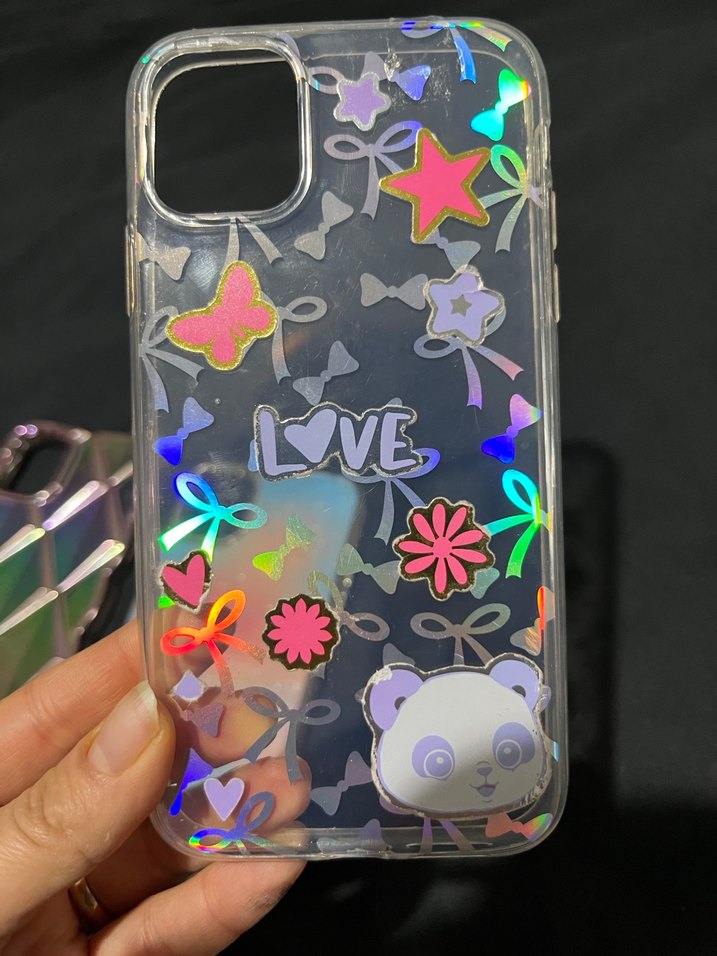 Parlak yüzeye sahip, renkli pop kültür desenleri içeren telefon kılıfı. Kelebekler, yıldızlar, çiçekler ve panda figürü bulunur.Hologram ufak tefek çizikler dışında hiçbir sorun yoktur.4 kılıf toplam fiyatıdır