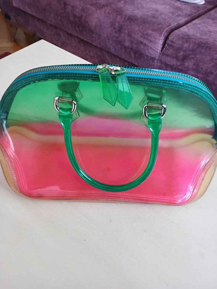 Parlak yüzeye sahip, plastikten yapılmış renkli kadın çantası. Tie-dye deseni ile modaya uygun, günlük kullanıma uygun şık bir tasarım.