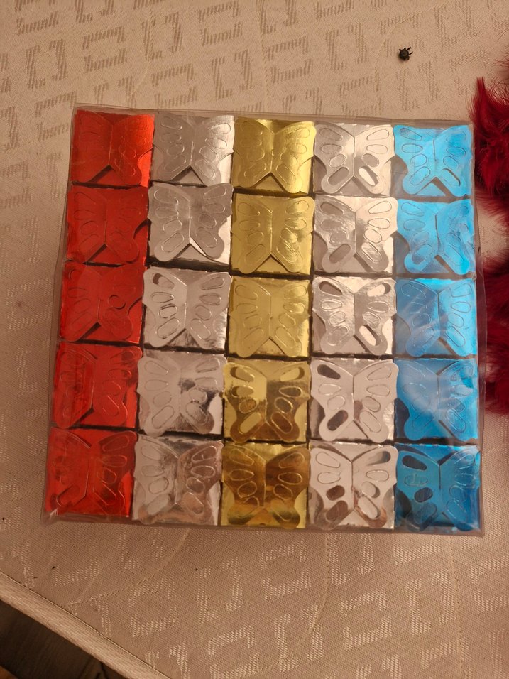 Kırmızı, altın, gümüş ve mavi renklerde parlak kelebek şeklinde kına
