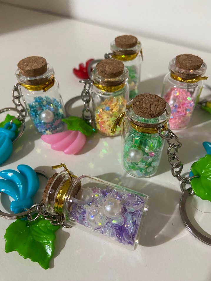 Parlak sim ve inci detaylı, mantar tıpalı küçük cam şişelerden oluşan renkli anahtarlıklar. Bohem ve retro tarz için uygun. ✨