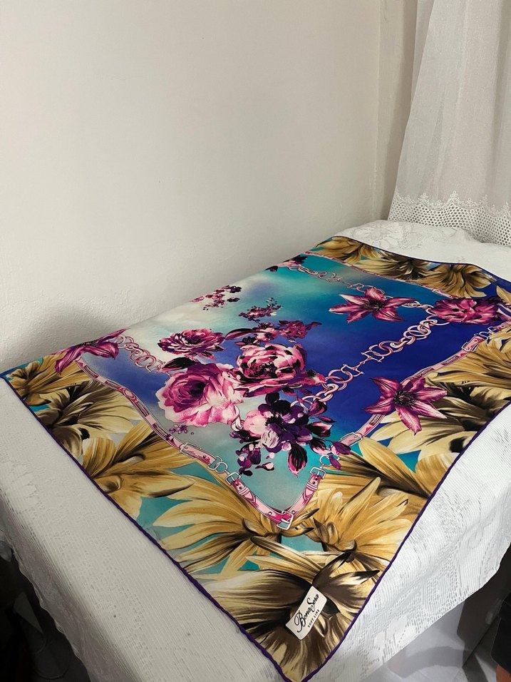 Parlak, saten kumaştan yapılmış, renkli çiçek desenli bohem tarzda fular. Canlı tasarımı retro ve hippie dokunuşlar taşır.