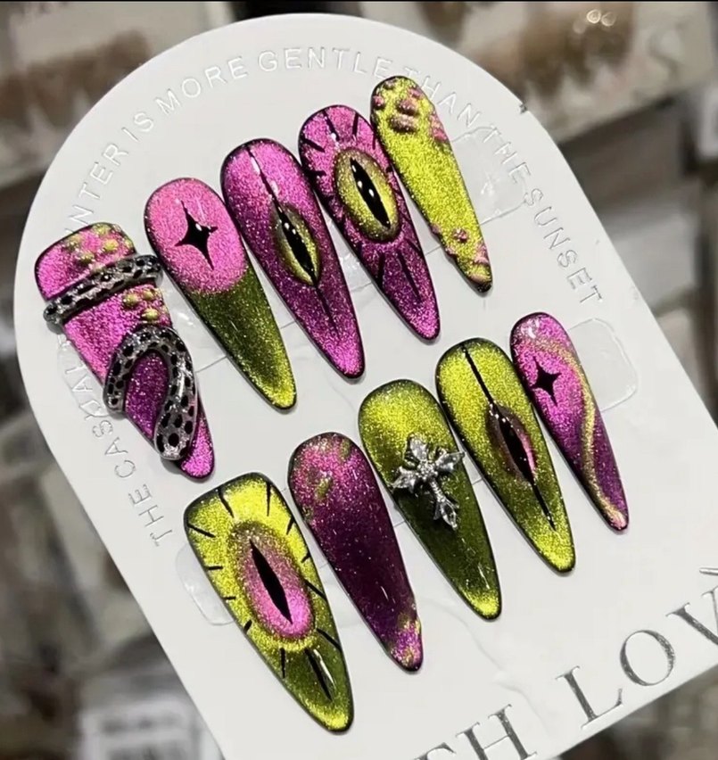 Pembe ve yeşil tonlarda detaylı desenlere sahip parlak ve renkli tırnak süslemeleri. Tırnaklara canlılık katmak için ideal.