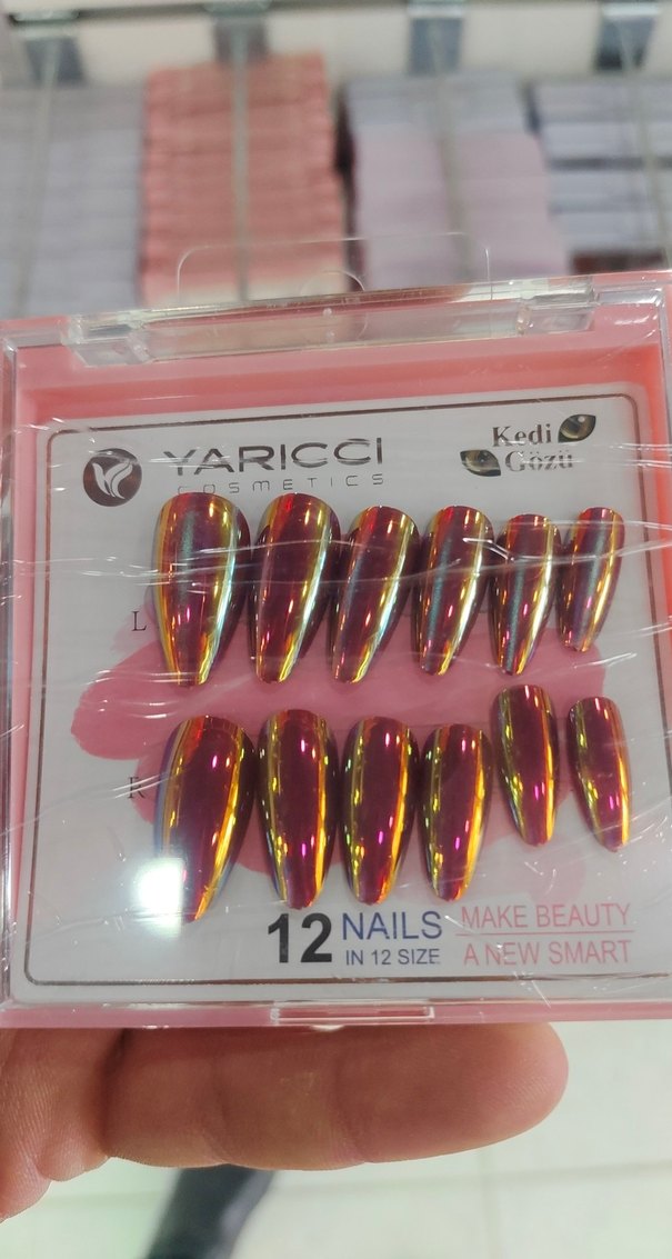 Yaricci Cosmetics tarafından 12 farklı boyutta, renkli ve parlak tırnak dekorasyonu seti. Canlı ve yansıtıcı yüzeye sahip 12 tırnak.