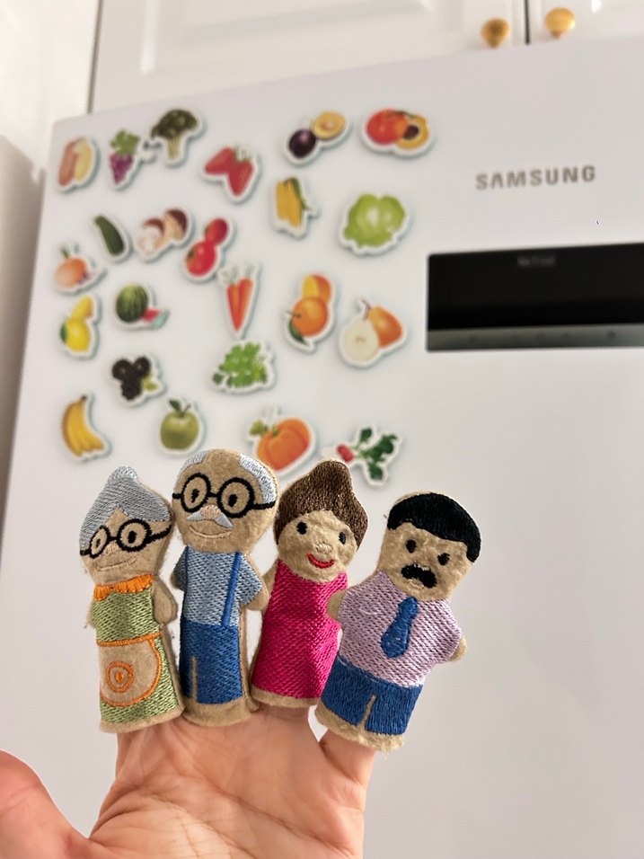 Yumuşak kumaştan yapılmış, aile üyelerini temsil eden renkli parmak kuklaları. Hayal gücünü destekler.