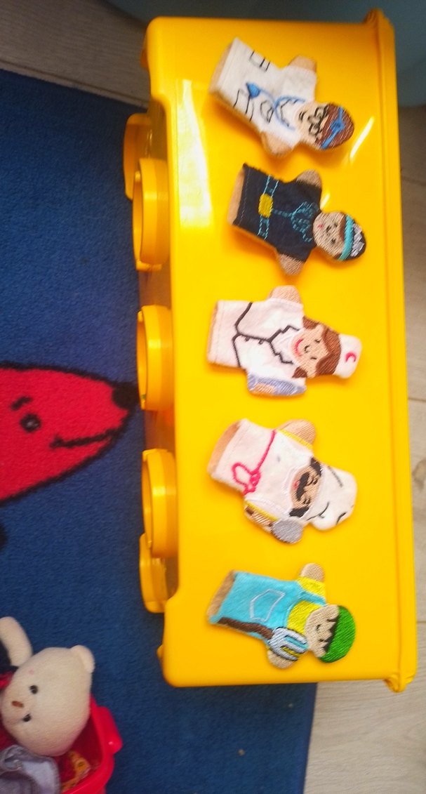 Çeşitli karakterlerin detaylı kıyafetleriyle sarı taban üzerinde renkli parmak kuklaları seti.