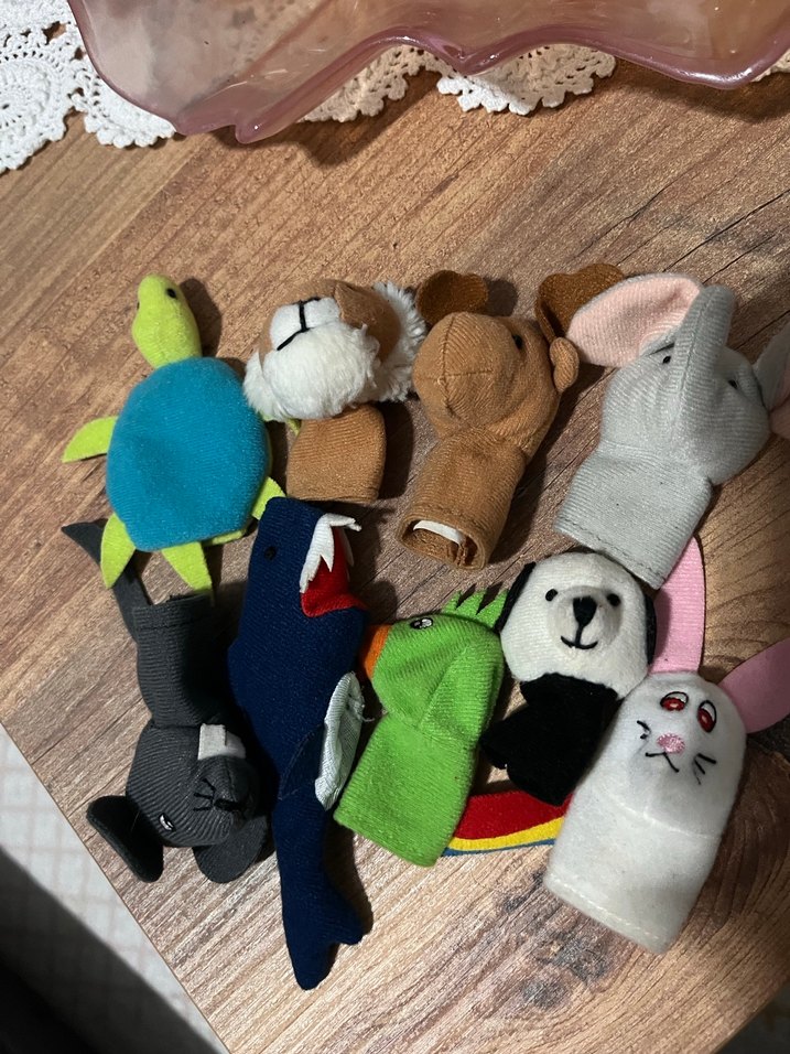 Birden fazla hayvan figürlü, yumuşak kumaştan yapılmış renkli parmak kuklaları seti. 10 adet