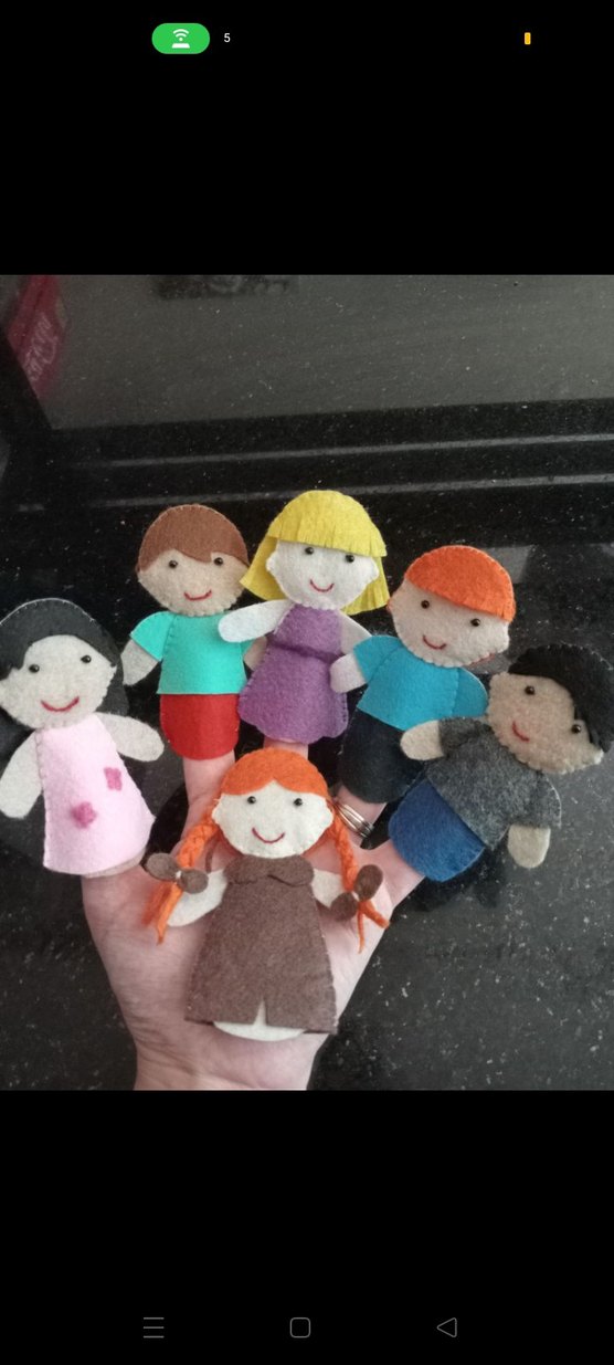 Yumuşak kumaştan yapılmış, farklı saç renkleri ve kıyafetlere sahip altı renkli parmak kuklası seti.