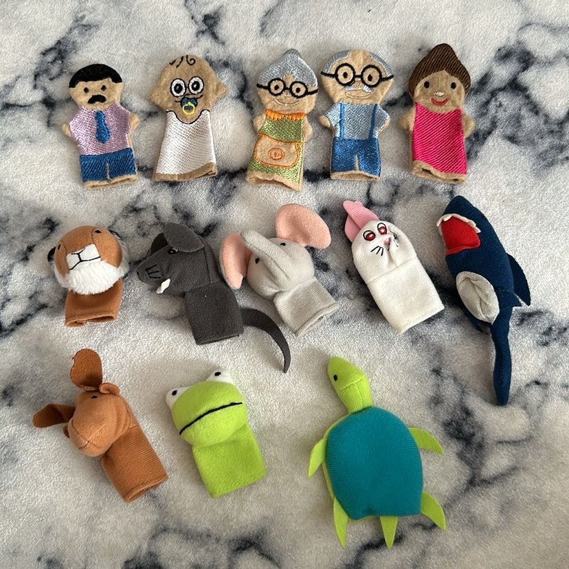 Yumuşak kumaştan yapılmış çeşitli karakter ve hayvan figürlü renkli parmak kuklaları seti.