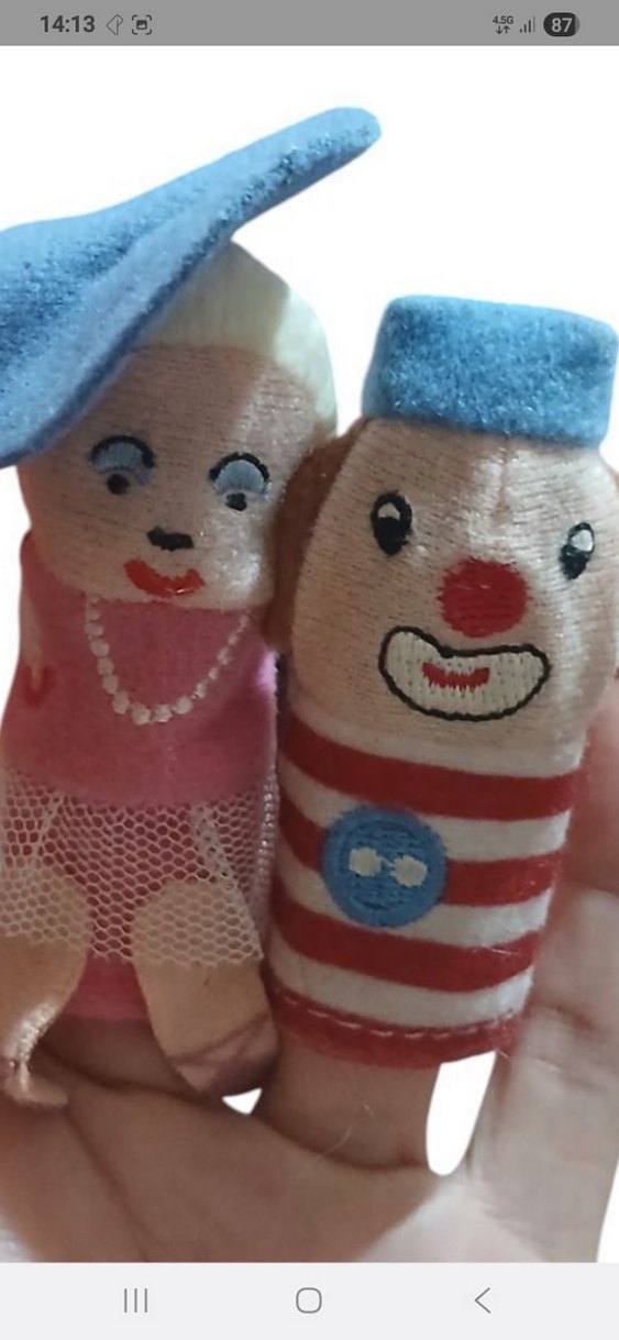 Mavi şapkalı kadın ve mavi kepli palyaço figürlü renkli parmak kuklaları. Yumuşak kumaş ve detaylı yüz ifadeleri içerir,7,9 cm