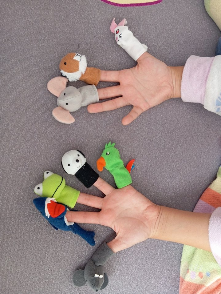 Çeşitli hayvan figürlü renkli parmak kuklaları, hayal gücünü destekler.