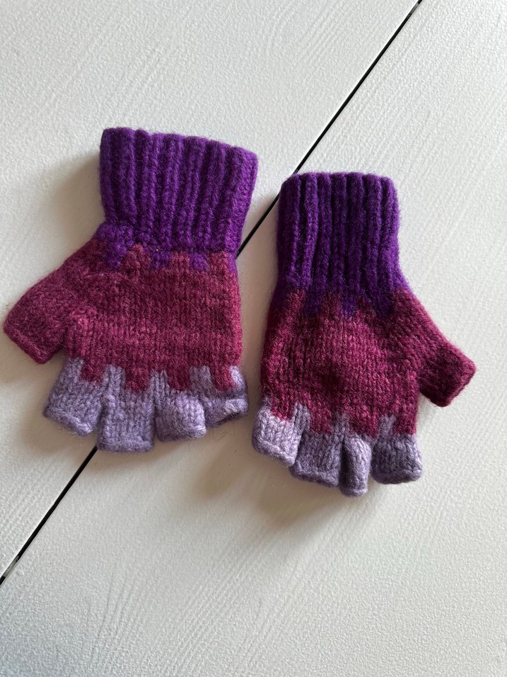Renkli, yumuşak kumaştan örülmüş parmaksız çocuk eldivenleri, canlı mor ve pembe tonlarıyla rahat ve bohem tarz sunar.