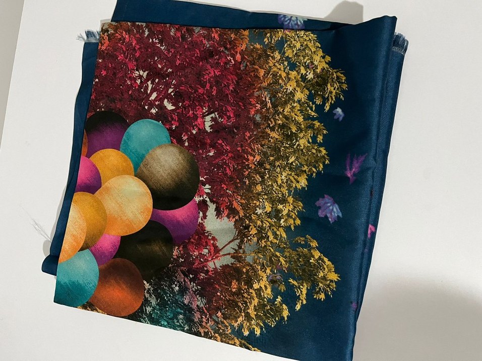 Canlı renklerde parti balonları ve sonbahar yaprakları desenli koyu zeminli eşarp