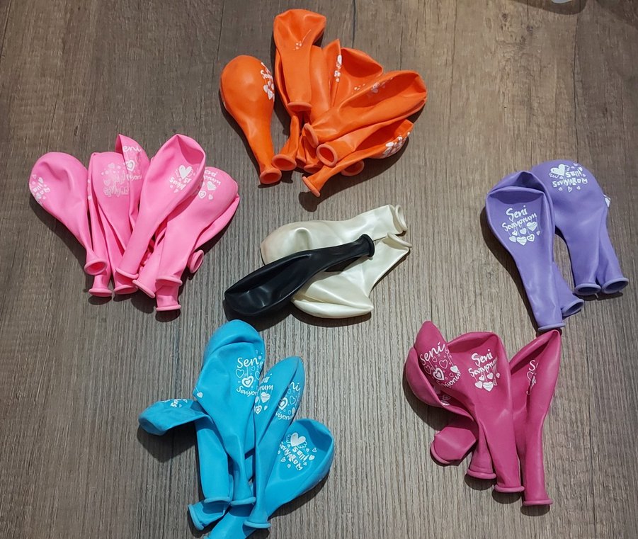 Pembe, turuncu, mavi, siyah, beyaz ve mor renklerde canlı parti balonları seti.