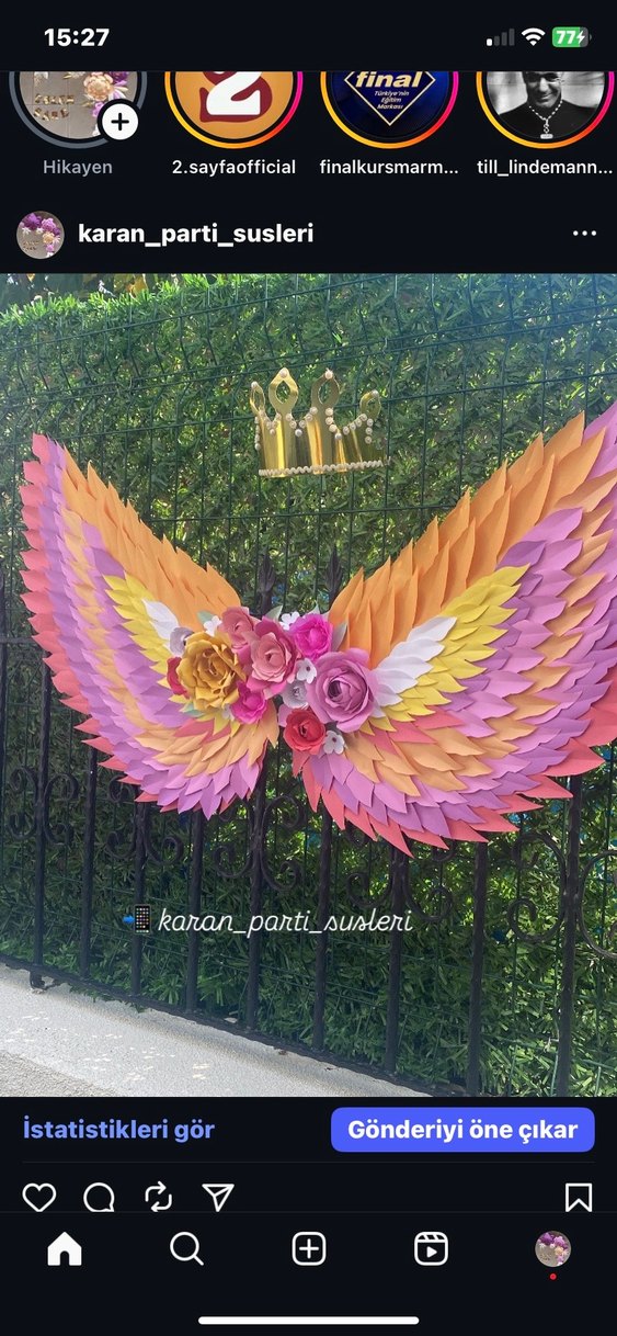 Katmanlı kağıt yapraklar ve çiçek detaylarıyla renkli parti kanat süsü ve uyumlu taç seti. Renkler değişebilir