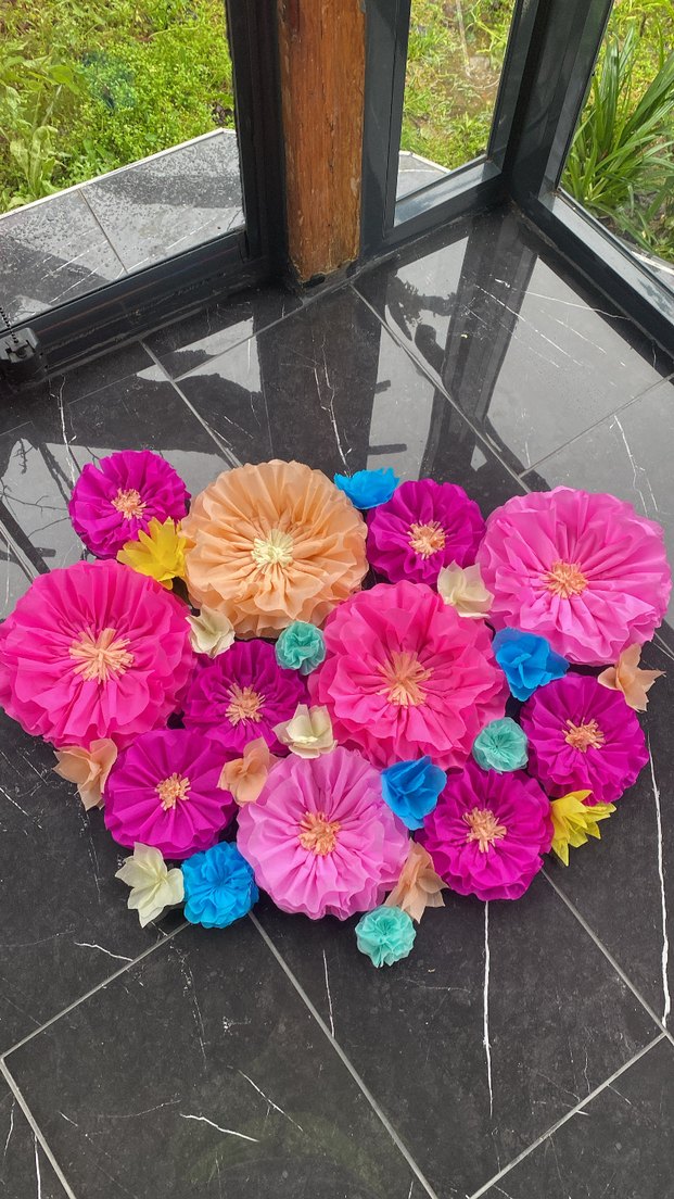 Canlı renklerde ve farklı boyutlarda kağıt çiçek parti süsleri. #kağıtçiçek #pembeçiçek