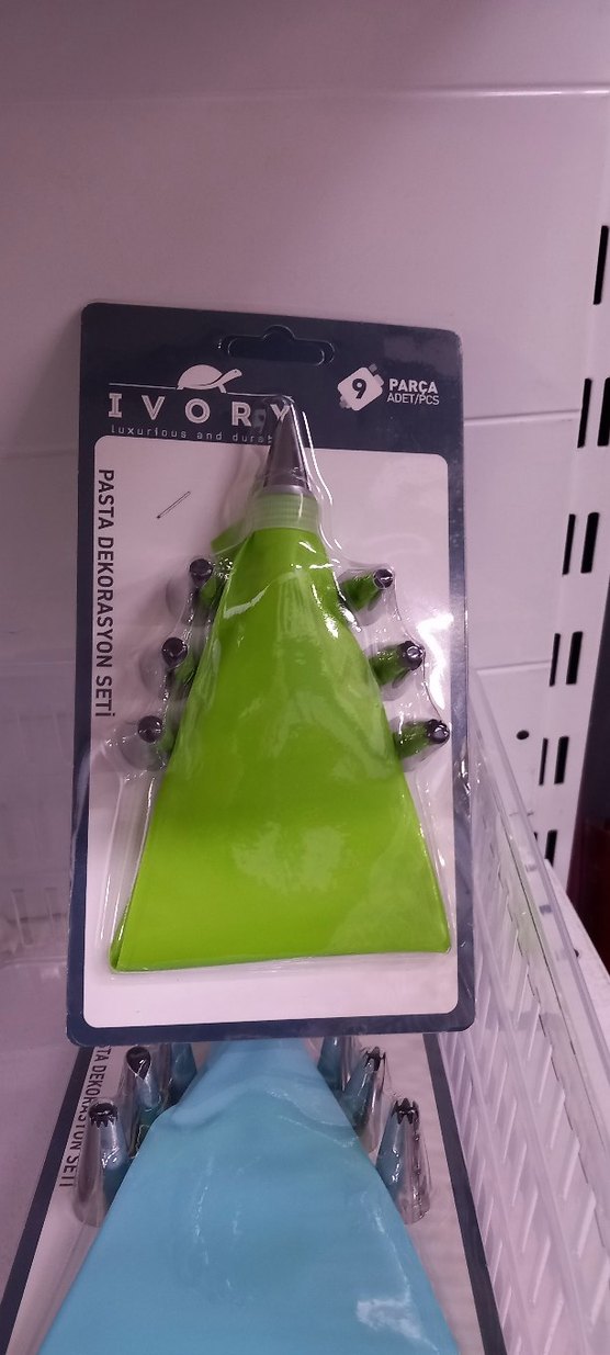 Canlı renkli 9 parçadan oluşan pasta dekorasyon seti, yeşil sıkma torbası ve çeşitli metal uçlar içerir.