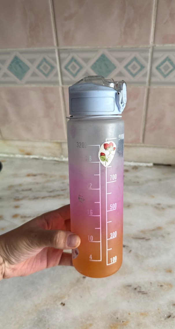 Pastel renkli, çok renkli gradyanlı ve 900ml ölçü işaretli, güvenli kapaklı bebek biberonu. Üzerinde çiçekli etiket bulunur.
