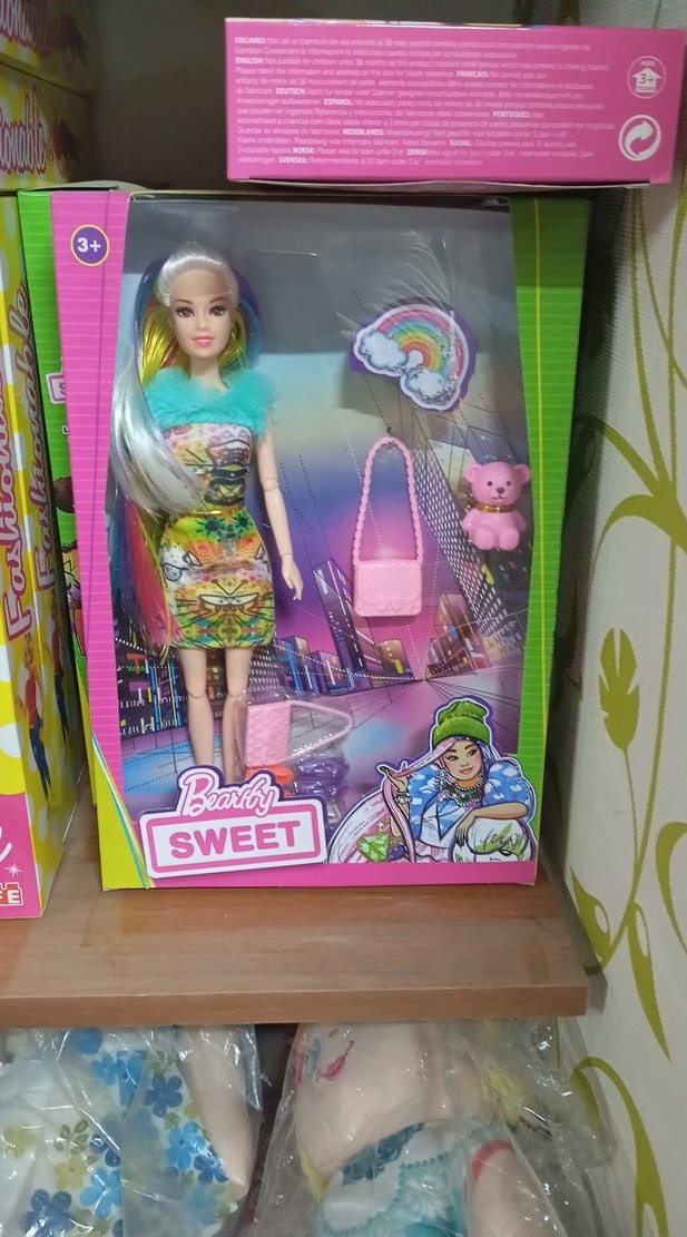 Canlı renklerde pastel elbiseli bebek, pembe çanta, küçük oyuncak ayı ve gökkuşağı figürü ile birlikte. Ambalajda "SWEET" yazısı bulunur.