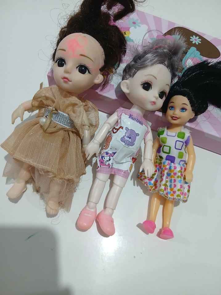 Pastel ve çok renkli kıyafetlere sahip, farklı saç stillerinde üç bebek seti. Oyun ve koleksiyon için uygun.
