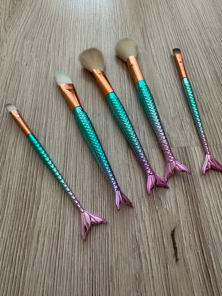 Pastel renklerde, denizkızı kuyruğu saplı makyaj fırçası seti. Yumuşak kıllarıyla çeşitli makyaj uygulamalarına uygundur.