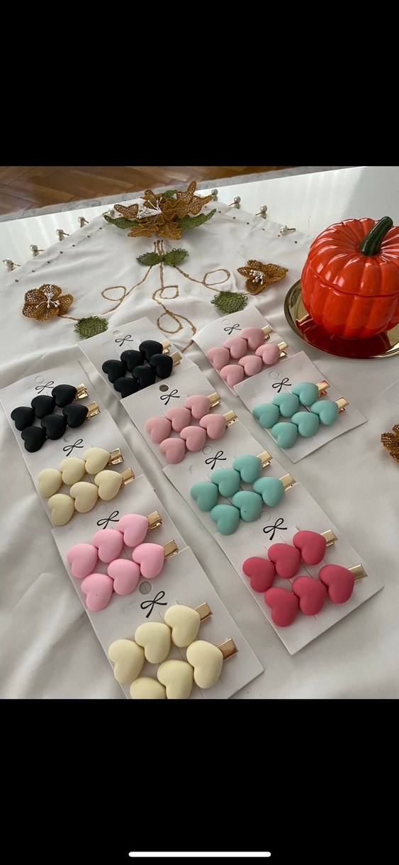 Yumuşak pamuktan yapılmış, boncuk detaylı pastel renkli kalp şekilli saç tokaları seti. Bohem tarzda, rahat bir görünüm sağlar. Çok renk seçeneği mevcut.