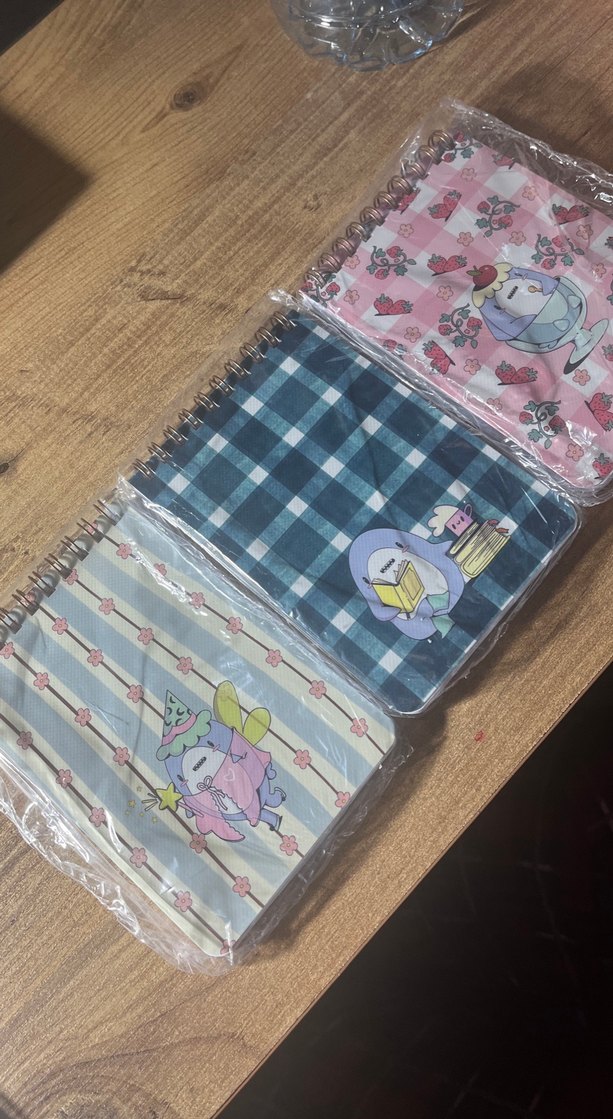 Üç adet pastel renkli kapaklı, sevimli çizgi karakterli spiralli defter seti.